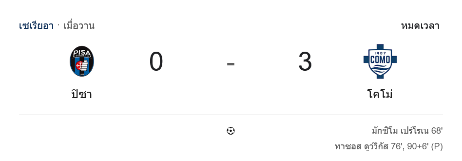 ศึกเซเรียอาแมตช์นี้ โคโมยกพลบุกเยือนถิ่นปิซ่าแล้วกวาดชัยแบบไม่ไว้หน้า เจ้าบ้านโดนทัพฟ้าขาวไล่ถล่ม 0-3 จากประตูของ มักซิม เปร์โรน นาที 68 และทาซอส ดูวิกัส เหมาคนเดียวสองลูก นาที 76 กับจุดโทษนาที 90+6 บ้านกีฬาเกาะติดรายงาน ผลบอลสด ตลอด 90 นาที ต้องบอกเลยว่ารูปเกมต่างชั้นกว่าที่สกอร์บอร์ดบอกเสียอีก โคโมครองบอลเกือบทั้งเกม ส่วนปิซ่าถอยไปยืนหน้าประตูตัวเองแทบตลอด