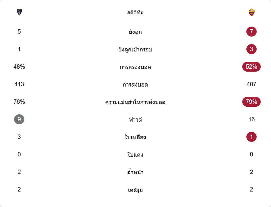 การครองบอลออกมาค่อนข้างสูสี เลชเช่ครองบอล 48% ส่วนโรม่าครอง 52% แต่จุดต่างสำคัญคือคุณภาพการจ่ายบอล ทีมเยือนจ่ายบอลทั้งหมดราว 407 ครั้ง ด้วยความแม่นยำถึง 79% ส่วนเลชเช่จ่าย 413 ครั้ง แม่นยำ 76% แปลว่าจังหวะคีย์พาสหลายครั้งของเลชเช่ถูกตัดทิ้งไปก่อนถึงพื้นที่สุดท้าย