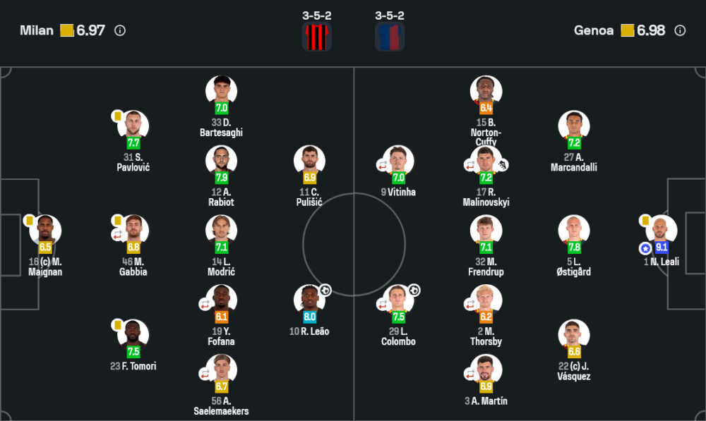 นักเตะโดดเด่นฝั่งมิลาน: เลเอา นอกจากทำประตูตีเสมอ ยังสร้างความปั่นป่วนให้แนวรับเจนัวตลอดเกม ขณะที่ ราบิโอต์ คุมจังหวะแดนกลางและไล่เก็บบอลสองจังหวะอย่างดุเดือด