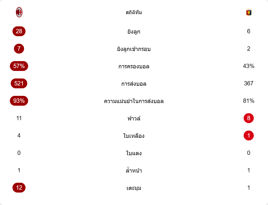ตัวเลขหลังเกมยืนยันภาพรวมว่ามิลานครองเกมแทบทั้งหมด เจ้าถิ่นมีโอกาสยิงถึง 28 ครั้ง เข้ากรอบ 7 ครั้ง ขณะที่เจนัวได้ยิงเพียง 6 ครั้ง เข้ากรอบ 2 ครั้งเท่านั้น การครองบอลมิลานอยู่ที่ 57% ต่อ 43% ส่งบอลสำเร็จ 521 ต่อ 367 ครั้ง แถมความแม่นยำในการจ่ายบอลของมิลานสูงถึง 93% มากกว่าเจนัวที่ 81% อย่างชัดเจน