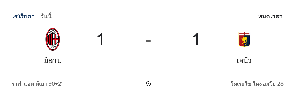 - ⚽ นาทีที่ 90+2: มิลานตีเสมอ 1-1 จากลูกเตะมุม ราฟาเอล เลเอา โขกเต็มศีรษะเสียบมุมล่าง
