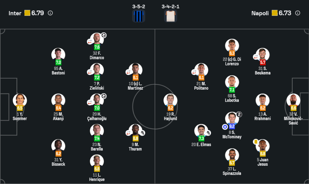 แมนออฟเดอะแมตช์ต้องยกให้ สก็อตต์ แม็คโทมิเนย์ กองกลางนาโปลีที่กดไปคนเดียวสองประตู พร้อมเรตติ้งสูงลิ่ว 9.2 เขาเล่นเหมือนมิดฟิลด์ตัวทะลุทะลวงที่อินเตอร์รับมือไม่ได้เลย ทั้งการวิ่งสอดจากแถวสอง การหาพื้นที่ว่างในเขตโทษ และการจบสกอร์ที่เฉียบขาด ลูกแรกอ่านจังหวะวิ่งเข้าไปยิงระยะเผาขน ส่วนลูกสองใช้การหาพื้นที่ตรงกลางเขตโทษ ก่อนแปเน้นๆ ไม่มีลังเล นอกจากประตูแล้ว แม็คโทมิเนย์ยังช่วยเบรกเกมรุกของอินเตอร์หลายครั้ง ทำให้แดนกลางนาโปลีไม่เสียสมดุล เป็นฟอร์มที่สะท้อนชัดว่าเขาคือหัวใจของทีมในเกมใหญ่แบบนี้อย่างแท้จริง