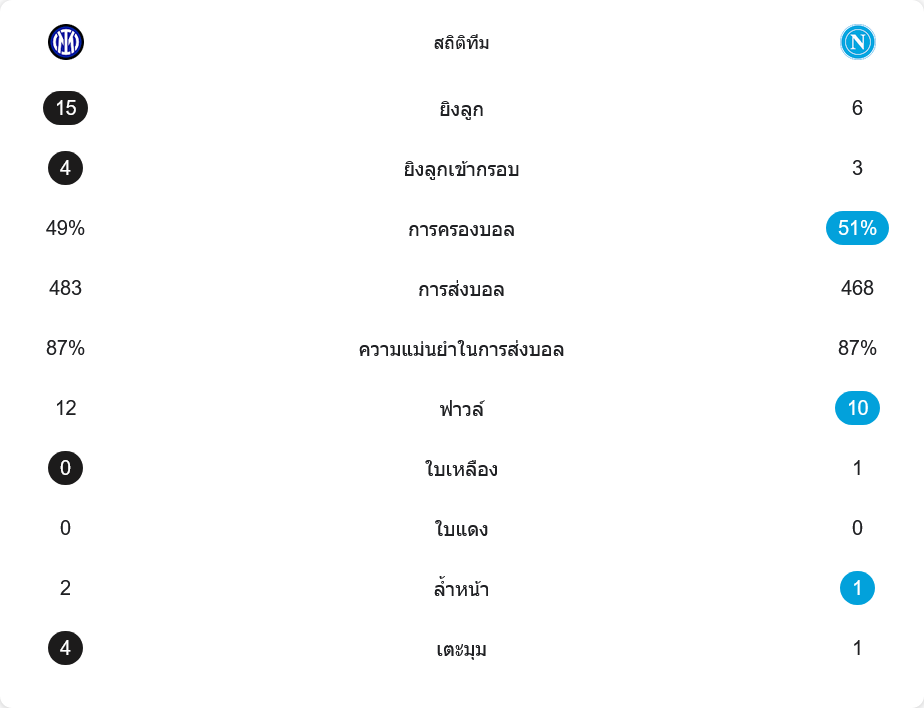ตัวเลขหลังเกมยืนยันภาพที่เห็นในสนาม อินเตอร์ครองบอล 49% สร้างโอกาสยิงรวม 15 ครั้ง เข้ากรอบ 4 ครั้ง แสดงให้เห็นถึงความต่อเนื่องในการบุก แต่จังหวะสุดท้ายยังไม่เฉียบคมมากพอ ขณะที่นาโปลีครองบอล 51% แม้สร้างโอกาสยิงได้เพียง 6 ครั้ง เข้ากรอบ 3 ครั้ง ทว่าความเฉียบของแม็คโทมิเนย์ทำให้พวกเขาเปลี่ยนโอกาสเล็กๆ เป็นสองประตูสำคัญได้อย่างมีประสิทธิภาพ