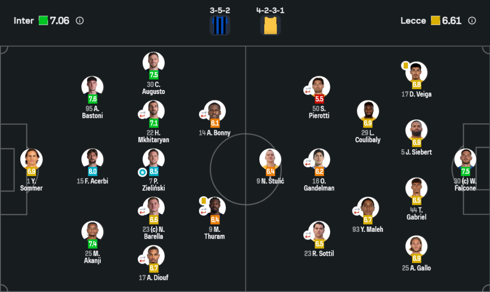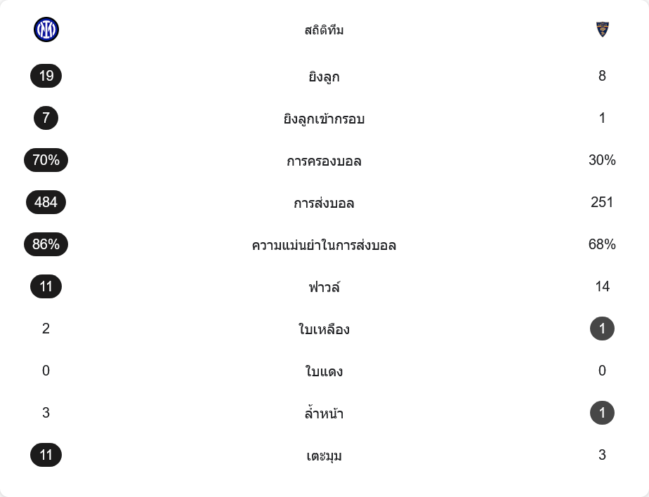 ตัวเลขหลังเกมสะท้อนชัดว่า อินเตอร์เหนือกว่าแทบทุกมิติ เจ้าถิ่นครองบอลถึง 70% ต่อ 30% ของเลชเช่ สร้างโอกาสยิงรวม 19 ครั้ง เข้ากรอบ 7 ครั้ง ขณะที่เลชเช่ได้ยิงเพียง 8 ครั้ง เข้ากรอบแค่ 1 หนเท่านั้น อินเตอร์ต่อบอลสำเร็จ 484 ครั้ง ด้วยความแม่นยำสูงถึง 86% เทียบกับเลชเช่ที่จ่ายสำเร็จ 251 ครั้ง แม่นยำ 68%
