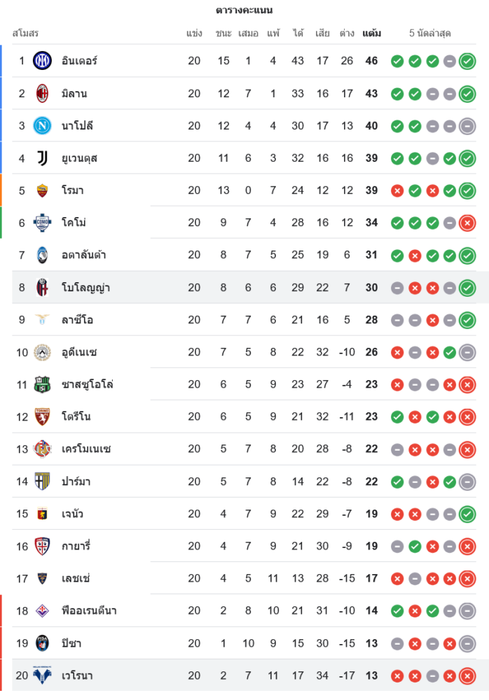 🏆 สถานการณ์ในตารางคะแนนกัลโช่ เซเรีย อา