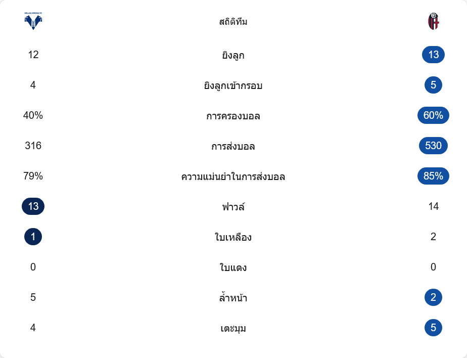 ตัวเลขหลังเกมสะท้อนรูปเกมชัดเจน เวโรน่ามีโอกาสยิงทั้งหมด 12 ครั้ง เข้ากรอบ 4 ครั้ง ขณะที่โบโลญญ่าลุ้นยิง 13 ครั้ง เข้ากรอบ 5 ครั้ง ทีมเยือนครองบอลมากกว่าชัดเจนที่ราว 60% ต่อ 40% และจ่ายบอลกันถึง 530 ครั้ง ความแม่นยำประมาณ 85% ส่วนเจ้าบ้านจ่ายราว 316 ครั้ง ความแม่นยำราว 79% แปลว่ารูปเกมโดยรวมโบโลญญ่าคุมจังหวะไว้ได้ ขณะที่เวโรน่าเน้นจู่โจมทีละดอก