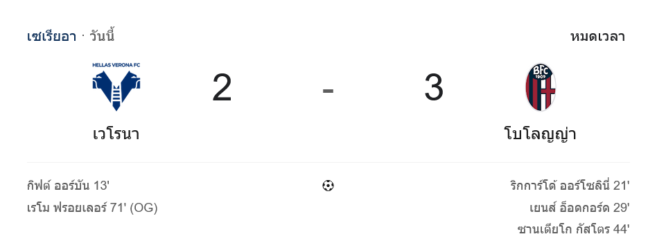 ช่วงทดเวลาบาดเจ็บ 5 นาที เจ้าถิ่นยกทีมขึ้นไปลุ้นทั้งลูกฟรีคิกและเตะมุม แต่แนวรับทีมเยือนยังไม่พลาด สุดท้ายเสียงนกหวีดดังขึ้น โบโลญญ่าบุกคว้าชัยเหนือเวโรน่า 3-2 แบบเหนื่อยแต่คุ้มค่าแต้ม