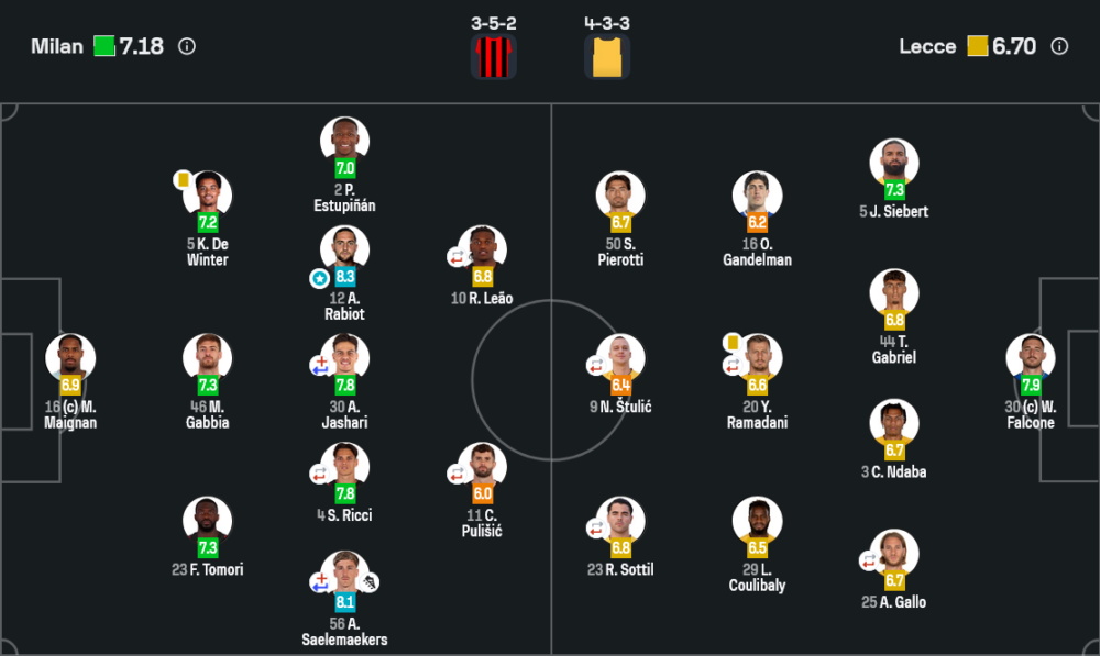 ฝั่งเลชเช่ของยูเซบิโอ ดิ ฟรานเชสโก เลือกยืน 4-3-3 เน้นรับลึกและรอจังหวะสวนกลับ ใช้สตูลิชเป็นเป้าหลักในการพักบอลและให้ปีกอย่างเปียโรตติกับซ็อตติลวิ่งฉีกไปด้านข้าง ช่วงครึ่งแรกพอมีโอกาสสองสามครั้ง แต่พอเจอการเพรสของมิลานหนักขึ้นในครึ่งหลัง เลชเช่แทบขึ้นบอลไม่ได้ ต้องอาศัยวินัยเกมรับและความเหนียวของฟัลโคเน่ล้วนๆ ถ้าไม่มีนายด่านคนนี้สกอร์คงไม่จบที่ 1-0 แน่นอน