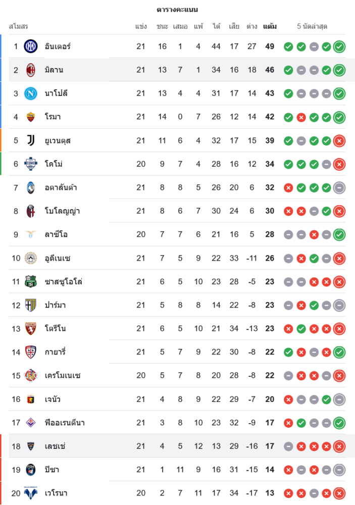 📊 สถานการณ์ในตารางคะแนนกัลโช่ เซเรีย อา