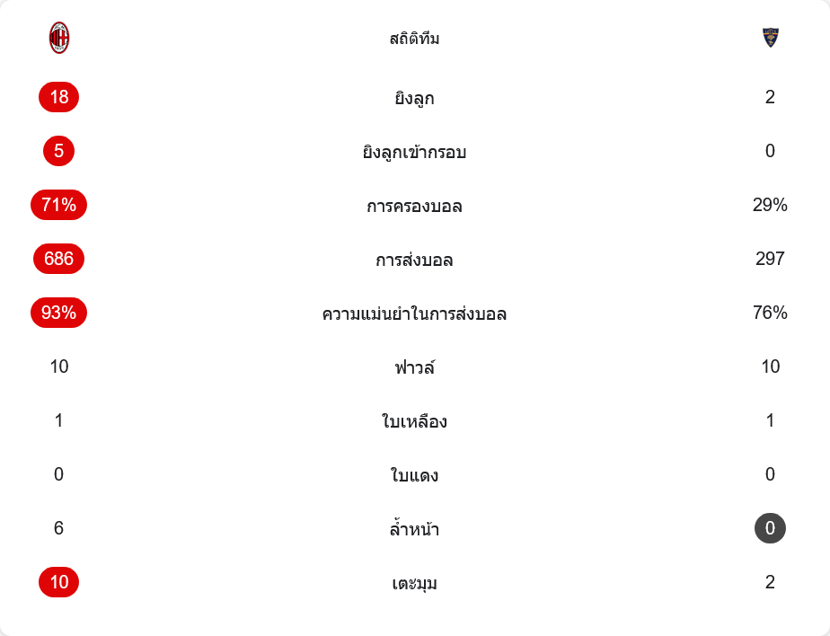 ตัวเลขหลังเกมสะท้อนชัดว่ามิลานเหนือกว่าแบบคนละชั้น เจ้าถิ่นยิงรวมถึง 18 ครั้ง เข้ากรอบ 5 ครั้ง ขณะที่เลชเช่มีโอกาสแค่ 2 ครั้งและไม่ตรงกรอบเลย การครองบอลมิลานครองไปถึง 71% ต่อ 29% ส่งบอลมากถึง 686 ครั้ง ความแม่นยำสูงถึง 93% ส่วนเลชเช่ส่งเพียง 297 ครั้ง แม่นยำ 76% เท่านั้น แสดงให้เห็นว่าทีมเยือนแทบไม่ได้ต่อบอลขึ้นเกมของตัวเอง