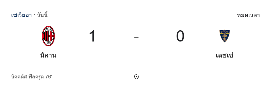 • ⏱ นาที 90+4 ผู้ตัดสินเป่าจบเกม มิลานชนะเลชเช่ 1-0