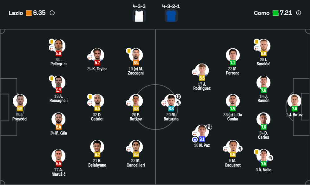 นอกจากประตูแล้ว ปาซยังคอยถอยต่ำมารับบอล ช่วยเปิดพื้นที่ให้บาตูรินาและโรดริเกซวิ่งทะลุไลน์กองหลัง จุดยืนระหว่างครึ่งช่อง (half-space) ทำให้ลาซิโอประกบไม่อยู่ และเป็นหัวใจสำคัญของการเซ็ตเกมรุกโคโม่ในค่ำคืนนี้จนได้รับเรตติ้งสูงถึง 9.1