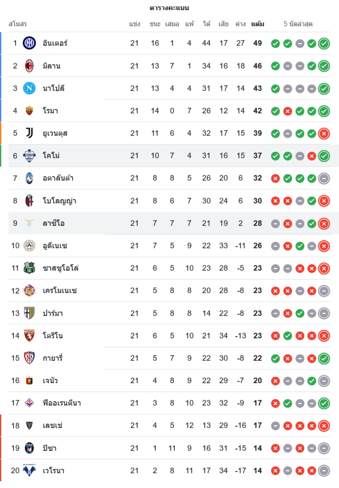 📊 สถานการณ์ในตารางคะแนน กัลโช่ เซเรีย อา