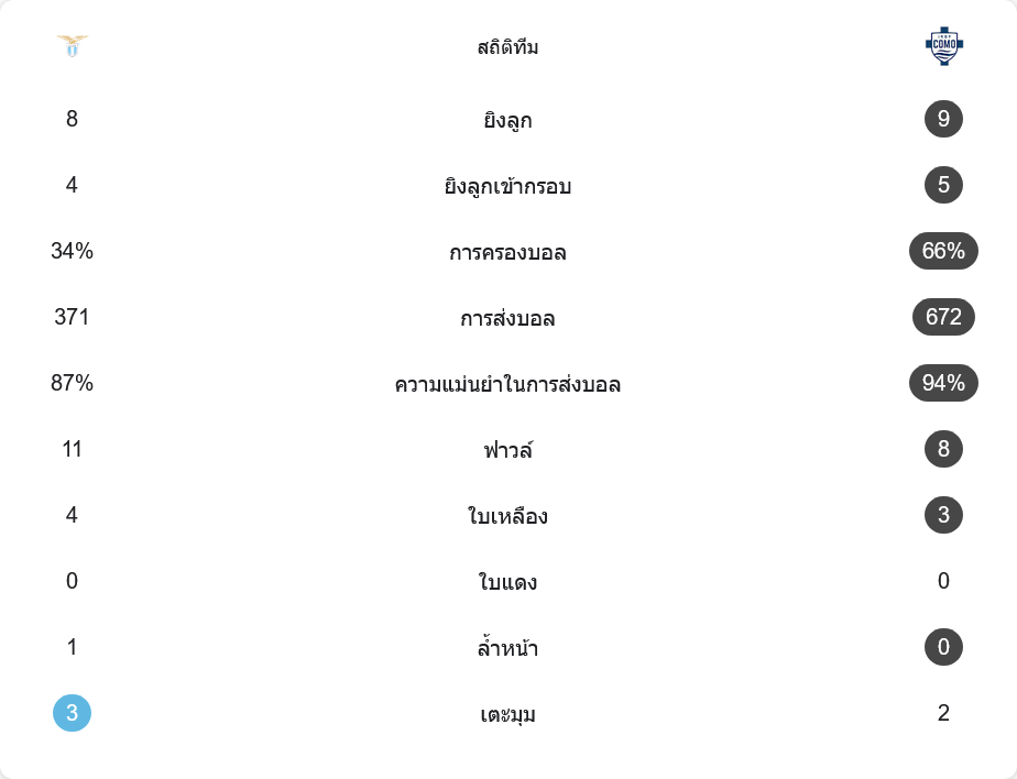 ตัวเลขหลังเกมสะท้อนภาพในสนามอย่างชัดเจน ลาซิโอมีโอกาสยิงทั้งหมด 8 ครั้ง เข้ากรอบ 4 ครั้ง ขณะที่โคโม่ยิง 9 ครั้ง เข้ากรอบ 5 ครั้ง แม้จำนวนจะใกล้เคียง แต่ความเฉียบคมต่างกันชัดเจน โดยเฉพาะสองประตูของปาซและลูกยิงเปิดหัวของบาตูรินาที่เปลี่ยนจังหวะเกมตั้งแต่ต้น