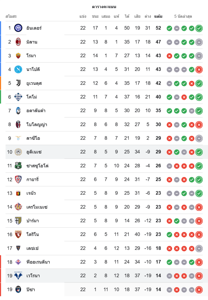 🪜 สถานการณ์ในตารางคะแนนกัลโช่ เซเรีย อา