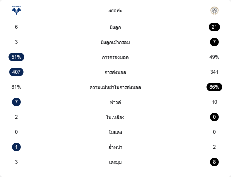 ตัวเลขหลังเกมสะท้อนภาพชัด เวโรน่าครองบอล 51% เหนือกว่าเล็กน้อย ส่งบอลทั้งหมด 407 ครั้ง สำเร็จ 81% ส่วนอูดิเนเซ่ครองบอล 49% ส่ง 341 ครั้ง แต่มีความแม่นยำสูงถึง 86% และที่โหดสุดคือจำนวนโอกาสยิง ทีมเยือนลั่นไกถึง 21 ครั้ง เข้ากรอบ 7 ลูก ขณะที่เจ้าบ้านยิงแค่ 6 ครั้ง เข้ากรอบ 3 ลูกเท่านั้น นั่นแปลว่าทุกครั้งที่อูดิเนเซ่บุก มีลุ้นประตูมากกว่าอย่างชัดเจน