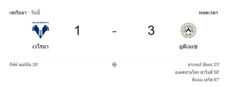 กัลโช่ เซเรีย อา ที่สตาดิโอ มาร์กอันโตนิโอ เบนเตโกดี ค่ำคืนนี้แฟนบอลได้เห็นดราม่าครบสูตร เมื่อเวโรน่าเปิดบ้านพลาดท่าพ่ายอูดิเนเซ่ 1-3 ทั้งที่รูปเกมช่วงแรกไม่ได้เป็นรอง บ้านกีฬาเช็กจากสกอร์แบบ ผลบอลสด นาทีต่อนาที บอกได้คำเดียวว่าเป็นอีกแมตช์ที่เวโรน่าทำตัวเองพัง ส่วนอูดิเนเซ่เล่นโคตรคม บุกมาคว้า 3 แต้มสำคัญแบบไม่เกรงใจเจ้าถิ่น