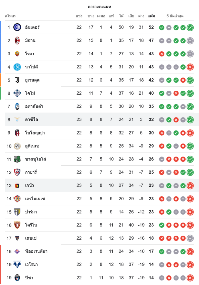 📈 สถานการณ์บนตารางคะแนนกัลโช่ เซเรีย อา