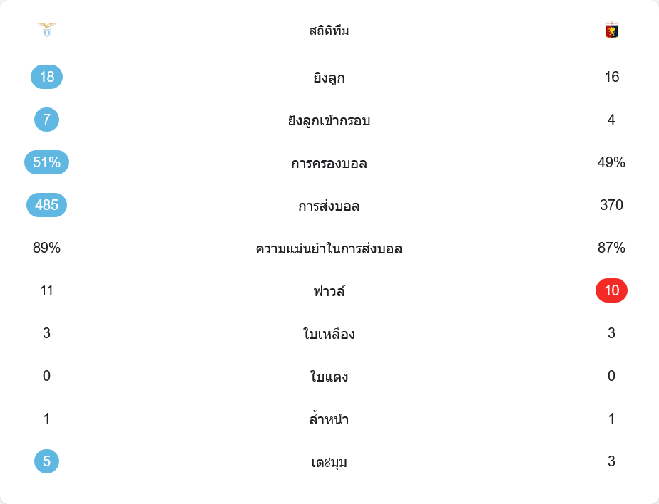 เกมนี้ไม่ได้มีเพียงจังหวะบุกแลกหมัด ตัวเลขฟาวล์ก็ชี้ให้เห็นความดุเดือด ลาซิโอทำฟาวล์ 11 ครั้ง เจนัว 10 ครั้ง ใบเหลืองฝั่งละ 3 ใบ ไม่มีใครโดนใบแดง ทั้งสองทีมยืนแนวล้ำหน้าได้ดี เสียเพียงฝั่งละหนึ่งครั้ง ขณะที่ลูกเตะมุม ลาซิโอเหนือกว่านิด ๆ 5 ต่อ 3 แสดงให้เห็นว่าพวกเขาเล่นเกมรุกจากด้านข้างได้บ่อยกว่าเล็กน้อย