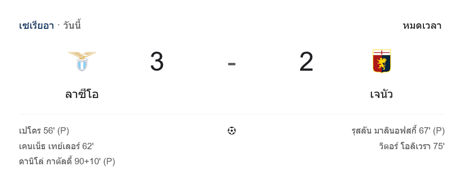 เกมกัลโช่ เซเรีย อา คู่มันที่สตาดิโอ โอลิมปิโก้ กลายเป็นแมตช์ดราม่าที่มีถึงสามจุดโทษ จบลงด้วยชัยชนะของลาซิโอที่เฉือนเจนัว 3-2 จากการซัดของเปโดร, เคนเน็ธ เทย์เลอร์ และดานิโล่ คาตัลดี้ ขณะที่เจนัวได้คืนจาก รุสลัน มาลินอฟสกี้ กับ วิตินญ่า ทำให้บรรยากาศเกมนี้เดือดตั้งแต่ต้นจนจบ สมชื่อเกมระดับเซเรีย อา ที่แฟนบอลเกาะขอบจอตามอัปเดตสกอร์แบบ ผลบอลสด นาทีต่อนาที
