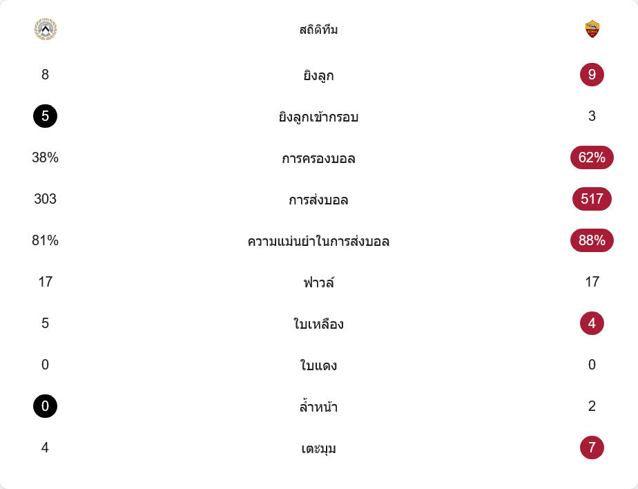 ตัวเลขหลังเกมสะท้อนภาพได้ชัด โรม่าเป็นฝ่ายครองบอล 62% ต่อ 38% จ่ายบอลสำเร็จ 517 ครั้งด้วยความแม่นยำ 88% เหนือกว่าอูดิเนเซ่ที่จ่าย 303 ครั้ง ความแม่นยำ 81% แต่เมื่อมองที่การจบสกอร์ กลับเป็นเจ้าถิ่นที่มีลูกยิงเข้ากรอบมากกว่า 5 ครั้งจากโอกาสทั้งหมด 8 หน ขณะที่โรม่ายิง 9 ครั้ง เข้ากรอบแค่ 3 นั่นทำให้แรงกดดันแท้จริงตกอยู่ที่แนวรับหมาป่ามากกว่าที่ตัวเลขครองบอลบอกไว้