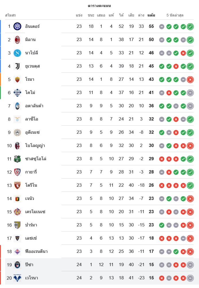 เหนือขึ้นไปคือ ฟรอซิโนเน ที่มี 17 คะแนน ทำให้ช่องว่างระหว่างโซนตกชั้นกับเส้นรอดยังพอ “เอื้อมถึง” หากใครสามารถเก็บชัยชนะติด ๆ กันได้ บ้านกีฬา มองว่าทั้งเวโรนาและปิซายังต้องเร่งเครื่องอย่างหนัก เพราะถ้าฟอร์มฝืดต่อเนื่องไม่ชนะใครอีกไม่กี่นัด โอกาสโดนทิ้งห่างในโซนแดงจะสูงขึ้นทันที