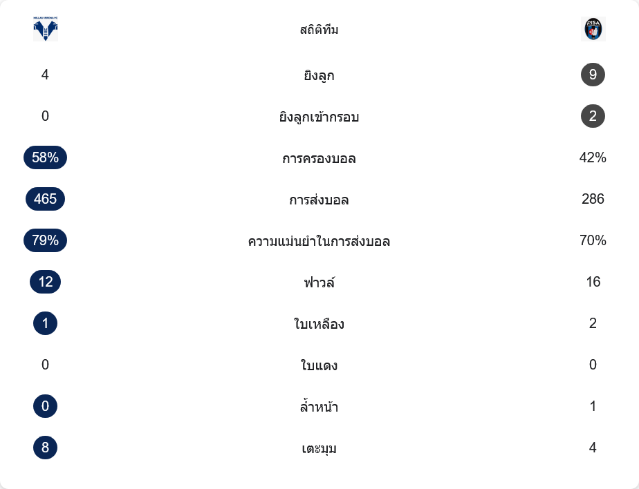 แม้ผลจบ 0-0 แต่ตัวเลขในสนามบอกเรื่องราวชัดเจน เวโรนาครองบอลมากถึง 58% ต่อ 42% ของปิซา ผ่านบอลทั้งหมด 465 ครั้ง เทียบกับทีมเยือน 286 ครั้ง และมีความแม่นยำในการจ่าย 79% เหนือกว่าปิซาที่ทำได้ราว 70% อย่างไรก็ตาม เมื่อมองที่การจบสกอร์ ปิซากลับสร้างโอกาสยิงได้ 9 ครั้ง เข้ากรอบ 2 ครั้ง ขณะที่เวโรนายิงเพียง 4 ครั้ง และไม่มีลูกไหนตรงกรอบเลย