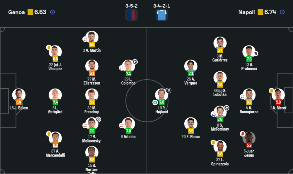 เจนัวเน้นบีบไลน์กลาง ใช้คู่หน้าวิตินญา–โคลอมโบเพรสกดดันแนวรับทีมเยือนตั้งแต่จังหวะออกบอลแรก เมื่อแย่งบอลได้ก็จะเติมวิงแบ็กอย่างมาร์กันดัลลีและนอร์ตัน–คัฟฟี่ขึ้นสูงเพื่อครอสเข้าใน จุดแข็งคือจังหวะสวนกลับเร็วและลูกยิงไกลของมาลินอฟสกี แต่ข้อเสียคือเมื่อทีมถอยลงตั้งรับลึกเกินไป ทำให้ระยะระหว่างไลน์กลางกับแนวรับกว้าง เปิดช่องให้แนวรุกนาโปลีหาพื้นที่เข้าทำได้บ่อย