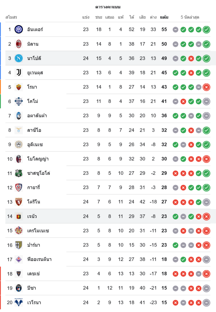 📈 สถานการณ์ในตารางคะแนนกัลโช่ เซเรีย อา