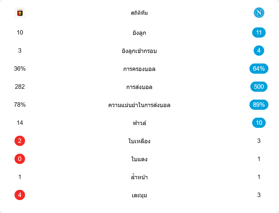 ตัวเลขหลังเกมสะท้อนภาพชัดเจนว่าทีมเยือนคุมจังหวะเอาไว้ส่วนใหญ่ เจนัวยิงทั้งหมด 10 ครั้ง เข้ากรอบ 3 ครั้ง ส่วน นาโปลีมีโอกาสยิง 11 ครั้ง เข้ากรอบ 4 ครั้ง ความแตกต่างจริง ๆ อยู่ที่การครองบอล ทีมเยือนถือบอลถึง 64% เทียบกับเจนัวเพียง 36% และจ่ายบอลมากถึง 500 ครั้ง ความแม่นยำสูงถึง 89% ขณะที่เจนัวจ่ายได้ 282 ครั้ง แม่นยำราว 78%