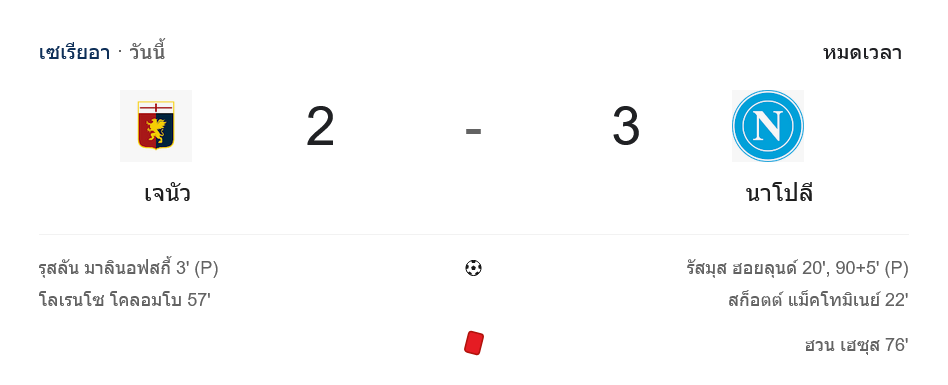 - ⚽ นาทีที่ 90+5 ราสมุส ฮอยลุนด์ ยิงจุดโทษเสียบมุมล่างให้นาโปลีนำ 2-3