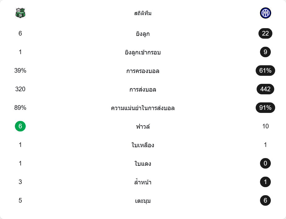 ตัวเลขหลังเกมยืนยันภาพในสนามแบบไม่ต้องเถียงกัน ซาสซูโอโล่ยิงได้เพียง 6 ครั้ง เข้ากรอบแค่ 1 ครั้ง ขณะที่อินเตอร์กดไปถึง 22 ครั้ง เข้าเป้าถึง 9 ครั้ง แปลว่าทุก ๆ การบุกของงูใหญ่มีลุ้นเป็นประตูแทบทุกหน การครองบอลก็ชัดเจน ซาสซูโอโล่ถือบอล 39% ส่วนอินเตอร์ครองบอลมากถึง 61% พร้อมผ่านบอลกว่า 442 ครั้ง ความแม่นยำสูงถึง 91% เหนือกว่าเจ้าถิ่นที่ผ่านบอล 320 ครั้ง ความแม่นยำ 89%