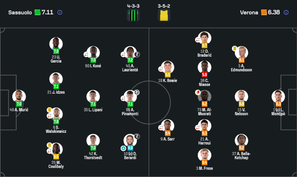 ภาพรวมเกมนี้มันเหมือนซาสซูโอโล่ยอมให้เวโรนาถือบอลมากกว่าเล็กน้อย แต่คุมพื้นที่สำคัญได้หมด เกมรุกของเจ้าถิ่นเล่นด้วยหลักการชัด เจาะตรงจุดที่แนวรับเวโรนามีช่องระหว่างไลน์ โดยเฉพาะจังหวะเปลี่ยนจากรับเป็นรุกที่เร็วและคม ลอริยองเต้กับเบราร์ดี้คือสองคนที่ทำให้เกมสวนกลับกลายเป็นอาวุธหนัก พอมีพื้นที่เมื่อไร เวโรนาถอยไม่ทันทันที