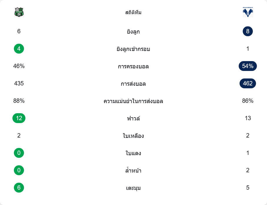 แม้เวโรนาจะครองบอลมากกว่าที่ 54 เปอร์เซ็นต์ และผ่านบอล 462 ครั้ง แต่ซาสซูโอโล่คือทีมที่เล่นให้เกิดผลจริง ยิงทั้งหมด 6 ครั้งแต่เข้ากรอบถึง 4 และเปลี่ยนเป็น 3 ประตูแบบเน้นคุณภาพมากกว่าปริมาณ ส่วนเวโรนายิง 8 ครั้งแต่เข้ากรอบแค่ 1 ครั้ง สะท้อนชัดว่าจังหวะสุดท้ายไม่เด็ดพอ เกมฟาวล์ใกล้เคียงกัน ซาสซูโอโล่ 12 ครั้ง เวโรนา 13 ครั้ง ใบเหลืองทีมละ 2 แต่เวโรนามีใบแดง 1 ใบ กลายเป็นจุดที่ทำให้ช่วงท้ายเกมหมดสิทธิ์กลับมาได้จริงจัง ขณะที่เกมริมเส้นและลูกนิ่งสูสีกัน ซาสซูโอโล่ได้เตะมุม 6 ครั้ง เวโรนา 5 ครั้ง