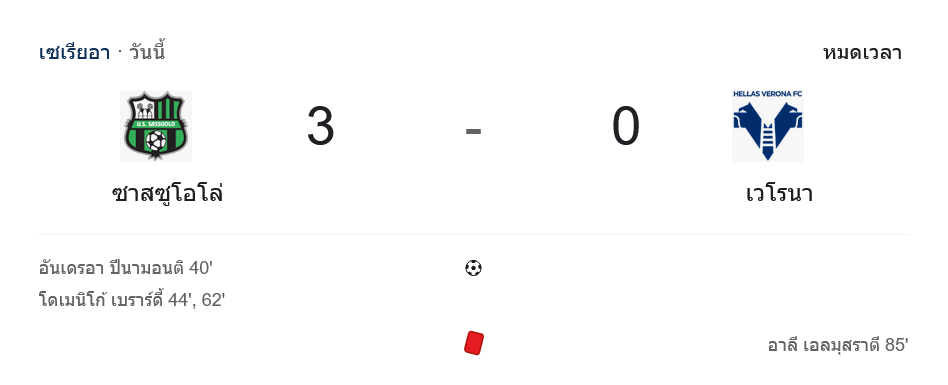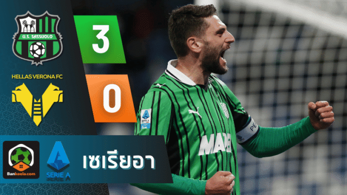 บ้านผลบอล สรุปหลังเกม เซเรีย อา เดือดคาสนาม เบราร์ดี้โชว์ของกดเบิ้ลพ่วงโทษแดง เวโรน่าพังยับ 0-3 ซาสซูโอโล่ส่งสัญญาณล่าท็อปโฟร์ต่อ