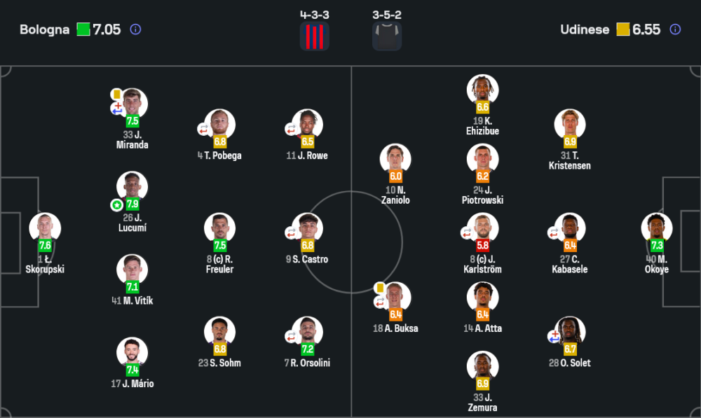 จอห์น ลูคูมี่ คือหัวใจเกมรับของโบโลญญ่าแบบไม่ต้องเถียง คะแนน 7.9 มาจากการยืนตำแหน่งที่โคตรนิ่ง อ่านบอลก่อนคู่แข่งหนึ่งจังหวะตลอด เวลาอูดิเนเซ่พยายามโยนหรือแทงทะลุช่อง ลูคูมี่เป็นคนตัดไฟได้หลายครั้ง ทำให้ทีมคุมทรงได้จนถึงช่วงที่เกมเปิดหน้าแลกหลังเสียประตู และนี่คือเหตุผลว่าทำไมโบโลญญ่าถึงรักษาสกอร์ 1-0 อยู่ได้จนจบ