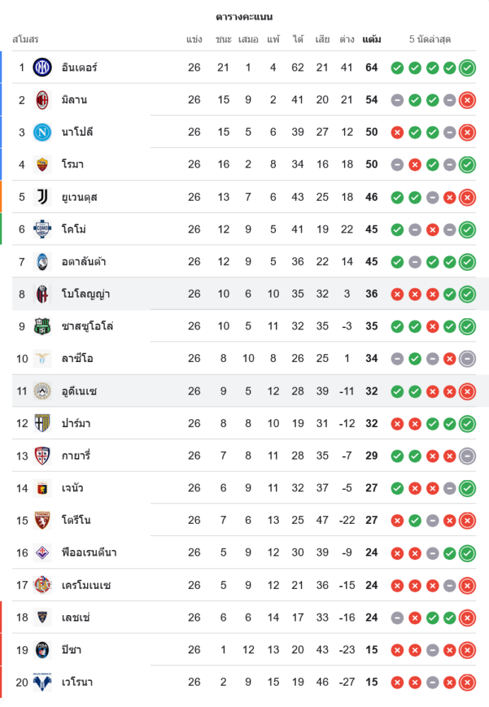 สามแต้มนี้ทำให้โบโลญญ่ายังยึดอันดับ 8 ด้วย 36 คะแนนจาก 26 นัด ช่องว่างกับกลุ่มลุ้นพื้นที่ยุโรปยังพอมีให้ไล่ต่อ แถมโมเมนตัมสำคัญคือเกมรับเริ่มนิ่งและชนะเกมอึดอัดได้ ส่วนอูดิเนเซ่อยู่ที่อันดับ 11 มี 32 คะแนนจาก 26 นัด ปัญหาหลักยังเป็นเกมรุกที่ต้องลุ้นจังหวะสุดท้ายมากเกินไป พอเจอทีมที่เพรสหนักและยืนแน่น ก็กลายเป็นเกมที่ครองบอลได้แต่กัดไม่เข้า
