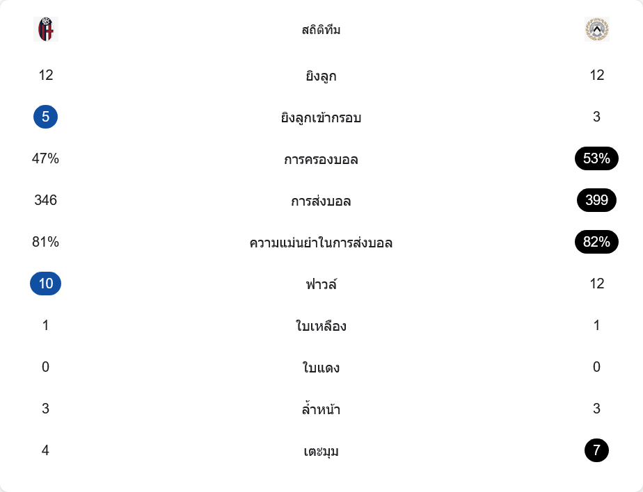 เกมนี้ยิงกันเท่ากันฝั่งละ 12 ครั้ง แต่โบโลญญ่าเปลี่ยนเป็นความอันตรายได้มากกว่าเพราะยิงเข้ากรอบ 5 ครั้ง ขณะที่อูดิเนเซ่เข้ากรอบ 3 ครั้ง การครองบอลทีมเยือนมากกว่าเล็กน้อยที่ 53 เปอร์เซ็นต์ แต่เป็นการครองที่วนไปมา เพราะโบโลญญ่าเพรสหนักจนจังหวะเข้าพื้นที่อันตรายไม่ต่อเนื่อง จำนวนการจ่ายบอลอูดิเนเซ่เหนือกว่า 399 ต่อ 346 และความแม่นยำพอๆ กันที่ 82 ต่อ 81 ฟาวล์อูดิเนเซ่มากกว่า 12 ต่อ 10 ใบเหลืองทีมละ 1 ใบ ไม่มีใบแดง ทั้งสองทีมล้ำหน้าฝั่งละ 3 ครั้ง จุดที่สะท้อนเกมบุกของทีมเยือนคือได้เตะมุมถึง 7 ครั้ง แต่โบโลญญ่ากันลูกกลางอากาศและกันจังหวะสองได้ดีมาก จนเตะมุมเยอะแค่ไหนก็ยังจบไม่คม