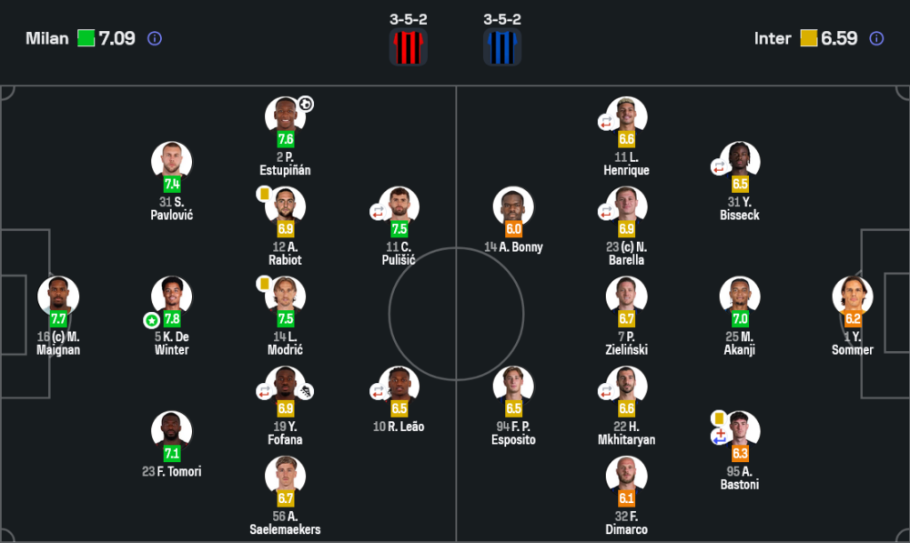 เกมรุกของมิลานอาจมีโอกาสไม่มาก แต่มีคุณภาพ ประตูของเอสตูปินญานคือภาพชัดที่สุดของทีมที่ใช้โอกาสไม่เปลือง ด้านเกมรับ เดอ วินเทอร์, ปาฟโลวิช และ โทโมรี่ ยืนกันอย่างมีวินัย โดยมี เมญอง เป็นกำแพงสุดท้ายที่เอาอยู่ทุกจังหวะกดดัน