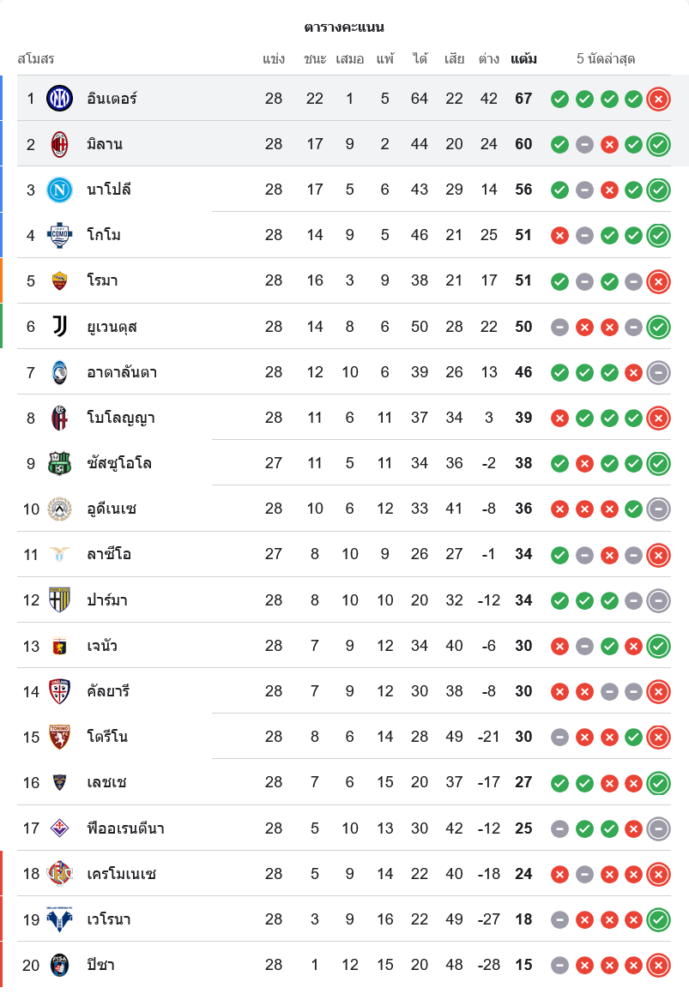สถานการณ์ในตารางคะแนนกัลโช่ เซเรีย อา