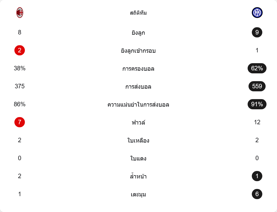 อินเตอร์ยังได้เตะมุมมากถึง 6 ครั้ง ส่วนมิลานได้ 1 ครั้ง ฟาวล์ของมิลานมี 7 ครั้ง ขณะที่อินเตอร์ทำ 12 ครั้ง ทั้งสองทีมโดนใบเหลืองฝั่งละ 2 ใบ และไม่มีใบแดงเกิดขึ้น สุดท้ายสถิติหลายด้านอาจเทไปทางงูใหญ่ แต่สกอร์บนหน้า บ้านผลบอล เป็นของมิลานแบบเต็มตัว
