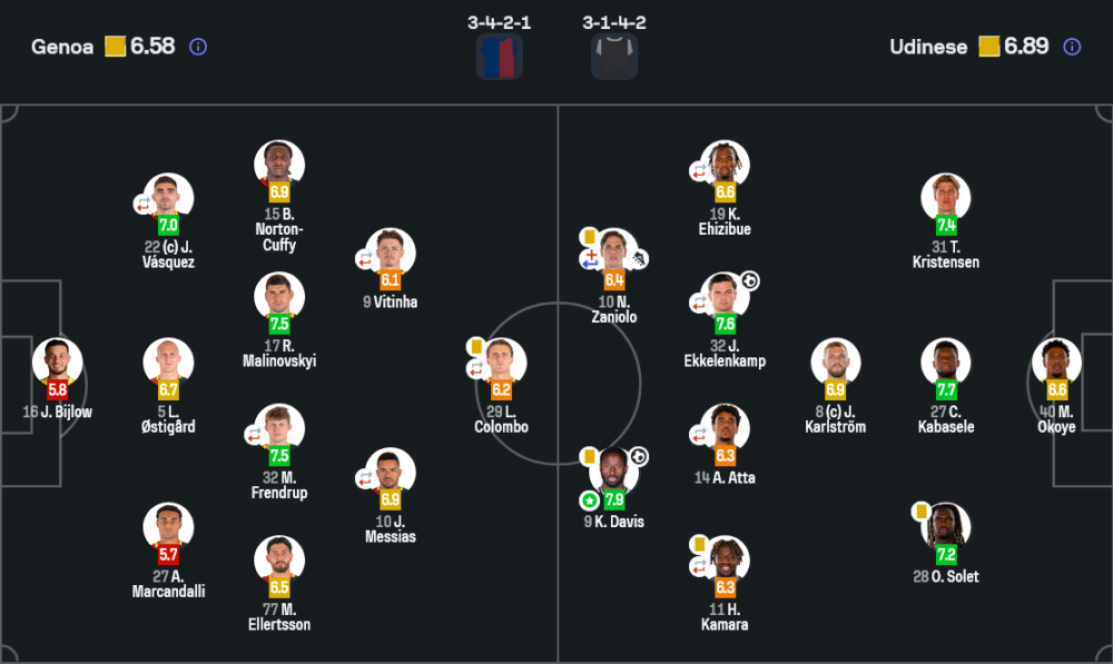 ฝั่งอูดิเนเซ่มาในระบบ 3-1-4-2 เน้นยืนโซนแน่น รับลึก และรอสวนกลับอย่างมีวินัย แม้ครองบอลน้อยกว่า แต่ทีมเยือนเลือกจังหวะบุกได้แม่นกว่า ใช้พื้นที่ที่เจนัวเปิดไว้เล่นงานได้ตรงจุด โดยเฉพาะประตูแรกที่มาจากการเข้าทำไม่กี่จังหวะแต่คมจัด