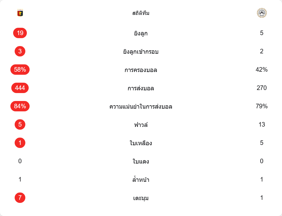 เจ้าถิ่นได้เตะมุม 7 ครั้ง ส่วนอูดิเนเซ่มีเพียง 1 ครั้ง เจนัวฟาวล์ 5 ครั้ง ขณะที่ทีมเยือนฟาวล์ 13 ครั้ง ทั้งสองฝั่งไม่มีใบแดง โดยเจนัวได้ใบเหลือง 1 ใบ ส่วนอูดิเนเซ่โดนไป 5 ใบ สถิติเหล่านี้ยืนยันชัดว่าเจนัวบุกมากกว่า แต่อูดิเนเซ่คมกว่าอย่างแท้จริง