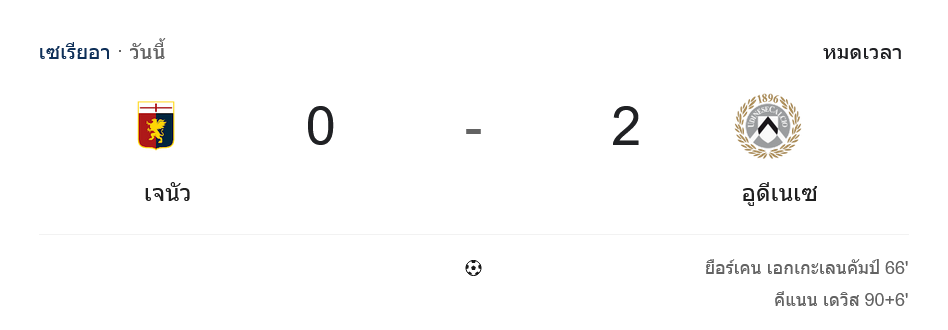 ศึก กัลโช่ เซเรีย อา คู่นี้ลงเอยแบบเจ็บลึกสำหรับเจนัว แม้จะเป็นฝ่ายครองเกม บุกมากกว่า และมีโอกาสลุ้นต่อเนื่อง แต่สุดท้ายกลับโดนทีเด็ดของอูดิเนเซ่เล่นงานจนแพ้คาบ้าน 0-2 ทำให้แฟนบอลที่ติดตาม ผลบอลสด ได้เห็นชัดว่าเกมนี้เจ้าถิ่นทำทุกอย่างเกือบครบ ขาดแค่ความคมในจังหวะตัดสิน