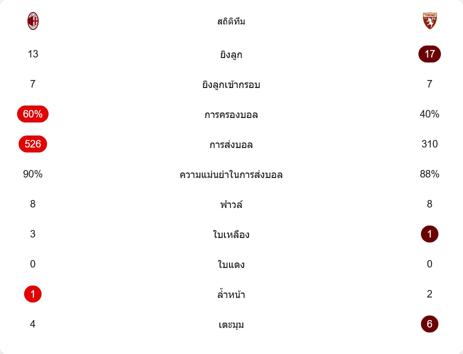 เกมนี้สูสีกว่าที่สกอร์บอก มิลานยิง 13 ครั้ง เข้ากรอบ 7 ครั้ง ส่วนโตริโน่ยิง 17 ครั้ง เข้ากรอบ 7 ครั้งเท่ากัน เจ้าถิ่นครองบอล 60 เปอร์เซ็นต์ ผ่านบอล 526 ครั้ง ความแม่นยำ 90 เปอร์เซ็นต์ ขณะที่ทีมเยือนครองบอล 40 เปอร์เซ็นต์ ผ่านบอล 310 ครั้ง ความแม่นยำ 88 เปอร์เซ็นต์ ทั้งสองทีมฟาวล์เท่ากันที่ 8 ครั้ง มิลานโดน 3 ใบเหลือง โตริโน่ 1 ใบ ไม่มีใบแดง โตริโน่ได้เตะมุมมากกว่า 6 ต่อ 4 และล้ำหน้า 2 ครั้ง ส่วนมิลานล้ำหน้า 1 ครั้ง ภาพรวมจึงเป็นเกม บ้านผลบอล ที่เข้มข้นและเปิดแลกกันจริงตลอด 90 นาที