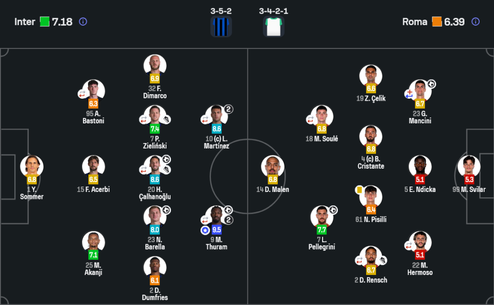 อินเตอร์มาในระบบ 3-5-2 และเล่นได้ครบเครื่องมาก เกมรุกไหลลื่นตั้งแต่แนวรับขึ้นมาแดนกลาง ชาลาโนลูเป็นศูนย์กลางในการคุมจังหวะ ขณะที่บาเรลล่ากับซีลินสกี้ช่วยเติมเกมได้อันตราย ดิมาร์โกและดุมฟรีส์ก็ยืนสูงกดวิงแบ็กโรม่าให้ถอยต่ำตลอด