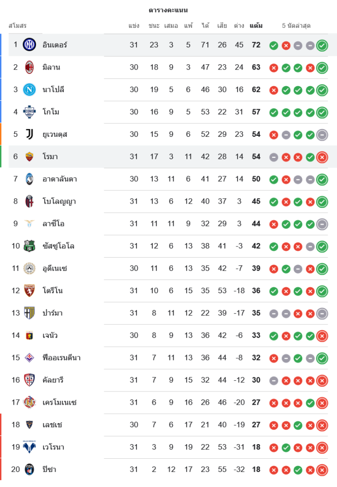 ส่วนโรม่าแพ้นัดนี้ยังมี 54 คะแนนจาก 31 เกม อยู่อันดับ 6 เท่าเดิม พลาดโอกาสสำคัญในการขยับขึ้นกดดันกลุ่มหัวตาราง และยังต้องลุ้นหนักต่อในเส้นทางแย่งพื้นที่ฟุตบอลยุโรป