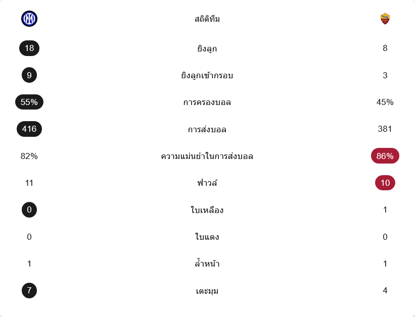 อินเตอร์เหนือกว่าค่อนข้างชัดในทุกด้าน ทั้งจำนวนโอกาสยิง 18 ต่อ 8 และยิงเข้ากรอบ 9 ต่อ 3 การครองบอลเป็นของเจ้าถิ่น 55 เปอร์เซ็นต์ พร้อมผ่านบอล 416 ครั้ง ความแม่นยำ 82 เปอร์เซ็นต์ ส่วนโรม่าแม้ผ่านบอลแม่นถึง 86 เปอร์เซ็นต์ แต่เปลี่ยนเป็นโอกาสลุ้นจริงได้น้อยกว่า อินเตอร์ยังได้เตะมุมมากกว่า 7 ต่อ 4 และไม่มีใบเหลืองหรือใบแดง ต่างจากโรมาที่โดน 1 ใบ ภาพรวมจึงสะท้อนชัดว่าเจ้าบ้านคุมเกมได้เด็ดขาดกว่า