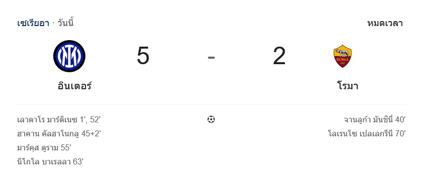 อินเตอร์เล่นด้วยความมั่นใจตั้งแต่ต้นจนจบ ขณะที่โรม่าแม้มีช่วงตอบโต้และยิงคืนได้ 2 ประตู แต่ภาพรวมยังต้านความดุดันของเจ้าถิ่นไม่อยู่ ส่งให้เกมนี้กลายเป็นอีกคืนที่แฟนบอลเช็ก ผลบอลสด แล้วต้องสะดุดกับสกอร์ที่ขาดเกินคาด