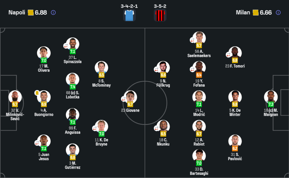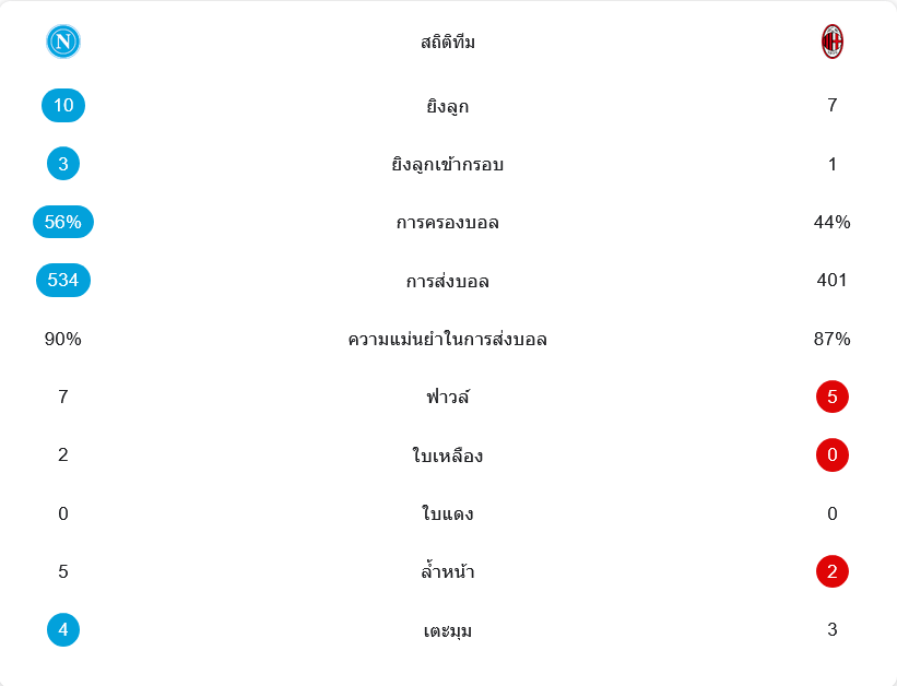 เกมนี้นาโปลีเหนือกว่านิดๆ แบบเห็นได้ชัดจากตัวเลข พวกเขายิง 10 ครั้ง เข้ากรอบ 3 ครั้ง ขณะที่มิลานยิง 7 ครั้ง เข้ากรอบเพียง 1 ครั้ง การครองบอลของนาโปลีอยู่ที่ 56 เปอร์เซ็นต์ เทียบกับมิลาน 44 เปอร์เซ็นต์ พร้อมจำนวนการผ่านบอล 534 ต่อ 401 ครั้ง และความแม่นยำในการจ่ายบอล 90 เปอร์เซ็นต์ ต่อ 87 เปอร์เซ็นต์ นอกจากนี้เจ้าถิ่นยังได้เตะมุม 4 ครั้ง มากกว่ามิลานที่ได้ 3 ครั้ง ภาพรวมจึงชัดว่านาโปลีเป็นฝ่ายคุมเกมและมีคุณภาพในจังหวะตัดสินมากกว่า